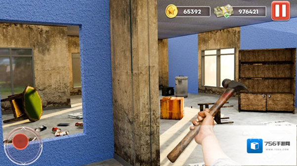 1、在破旧房屋场景,操控手持锤子角色,按箭头指引破坏指定位置(如蓝色墙体),获取改造资源。